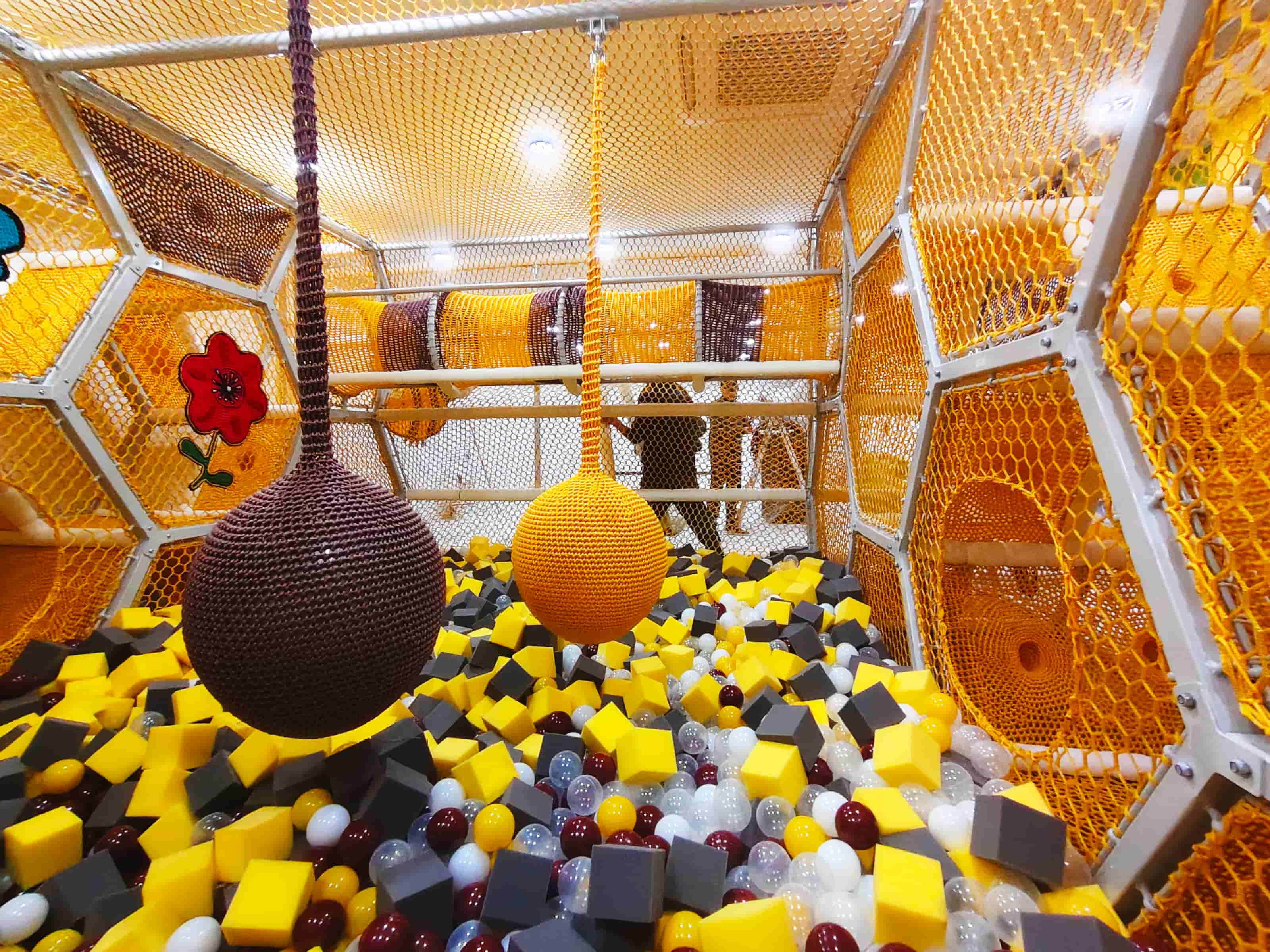 整体空间采用六边形蜂巢结构作为基础单元,通过墙面、顶面与地面的绳网一体化设计,实现空间的高效围合与动线延展。手工编织绳网与软包骨架相结合,在保证结构安全与耐用性的同时,形成高度统一且具有识别度的主题视觉。黄色、棕色与白色的配色体系,强化了亲切、活跃的空间氛围。